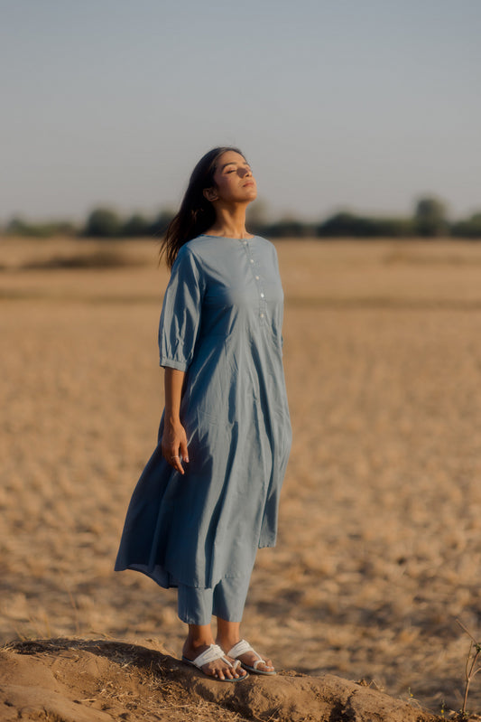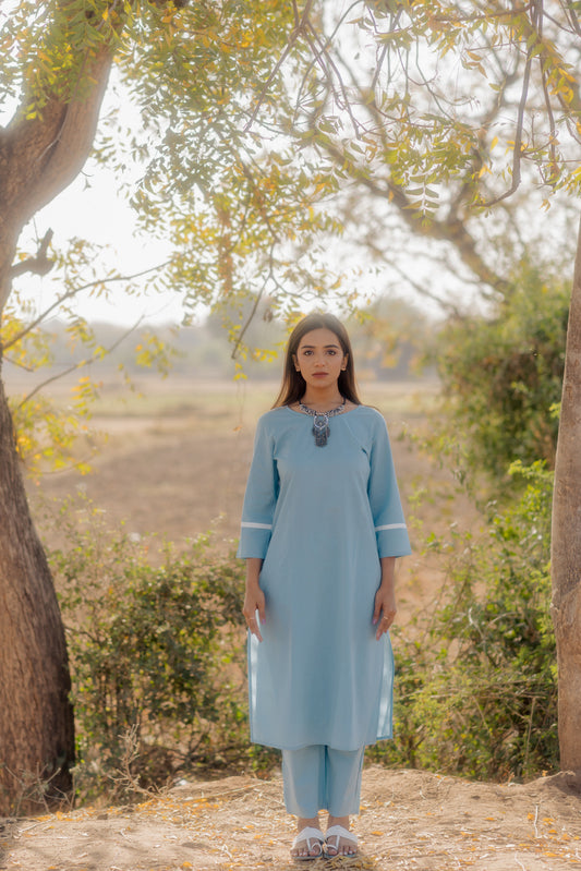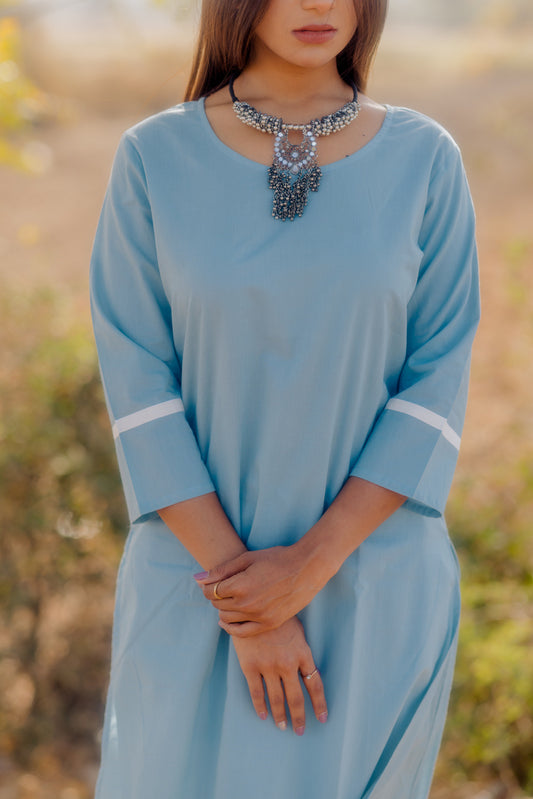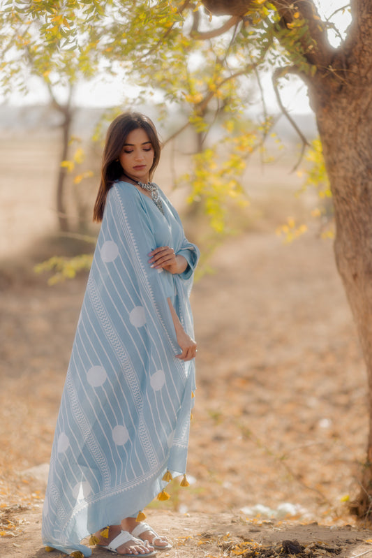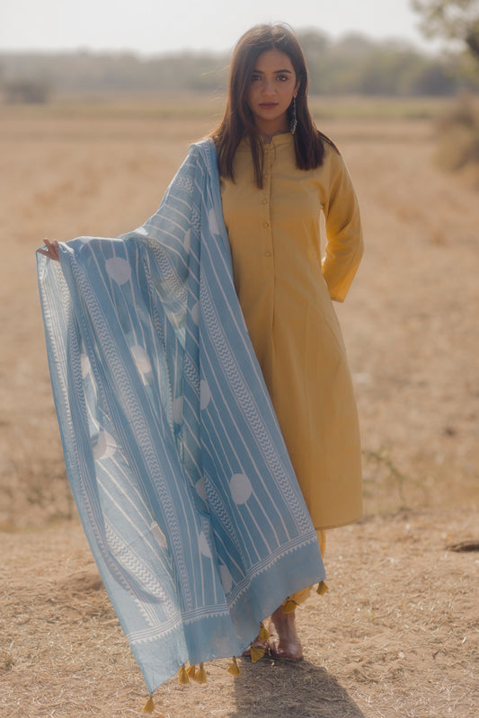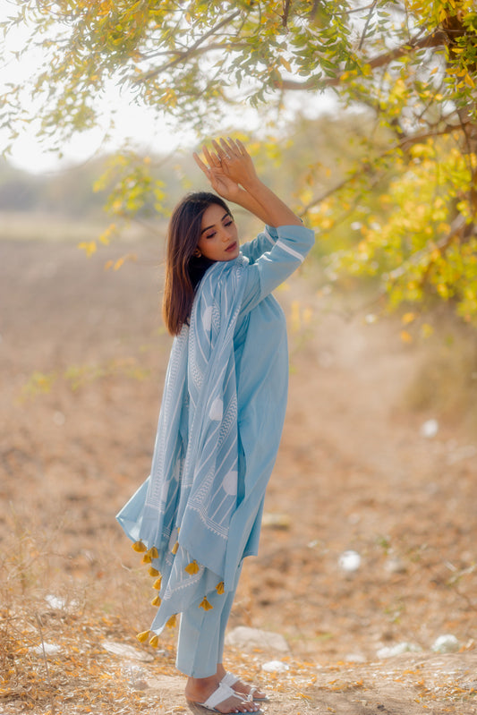 Crisp white kurta set with Aqua blue Printed Dupatta