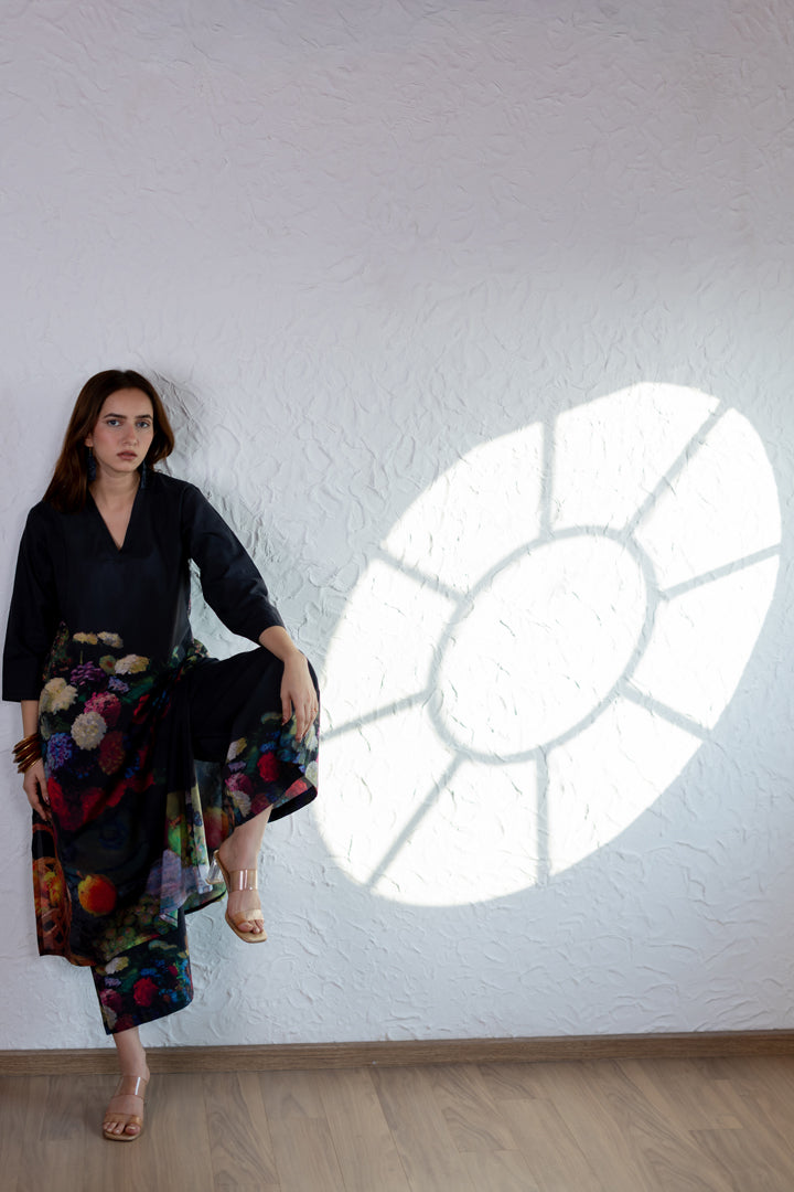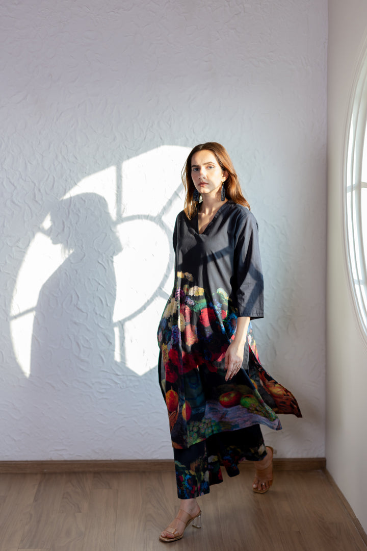 This black printed cambric kurta pant set is a timeless addition to your everyday wardrobe.