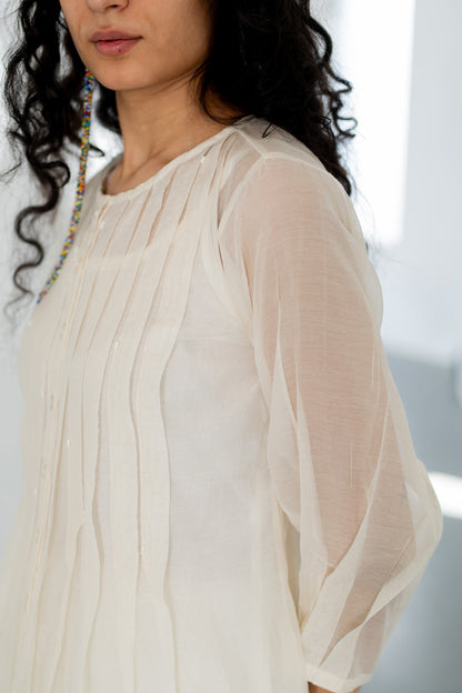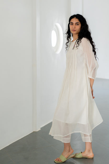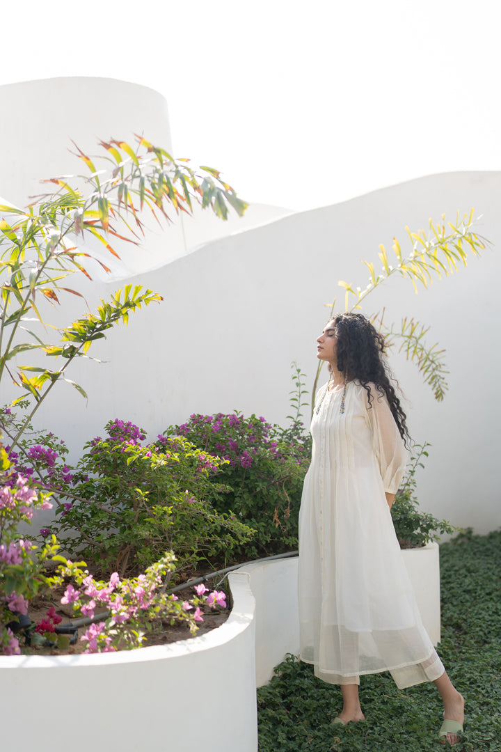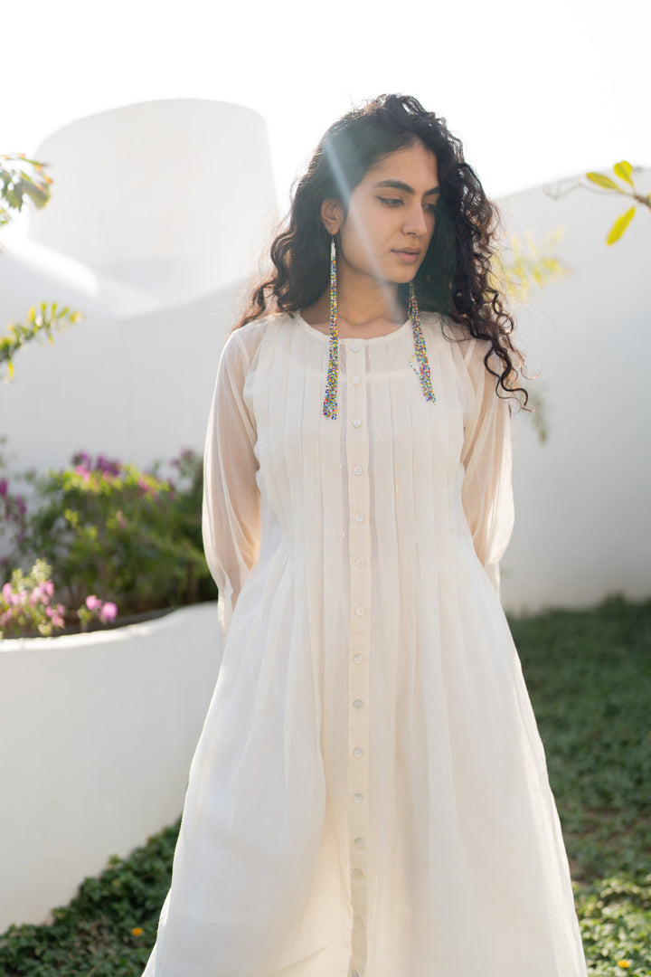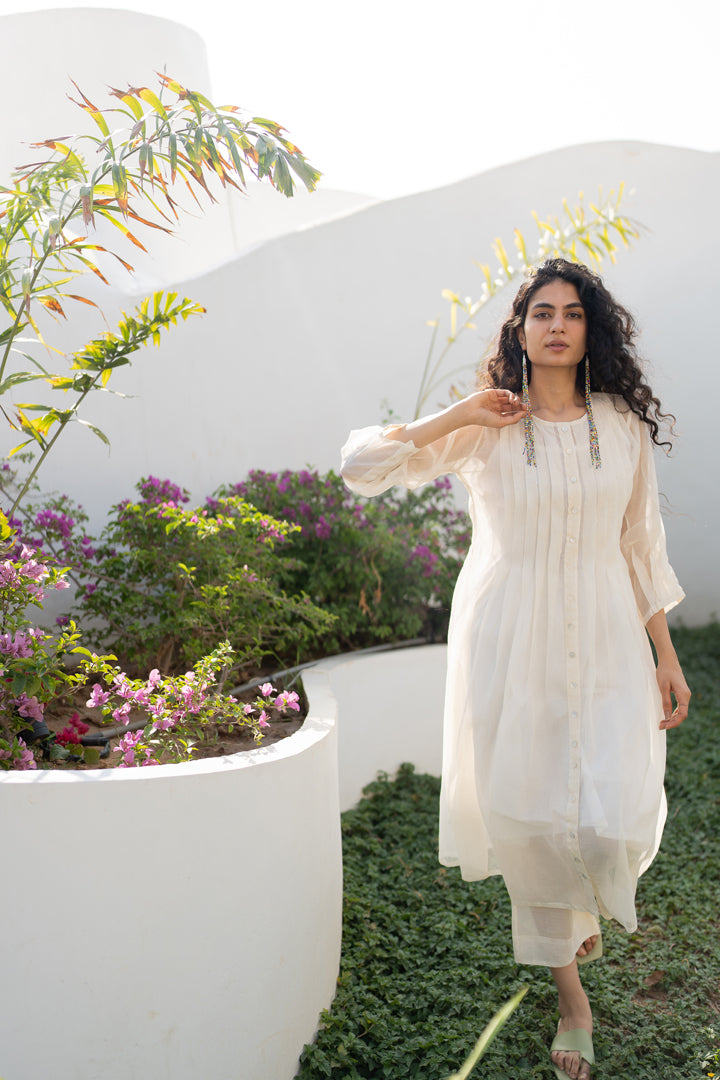 Introducing our Dewy Mist Pleated Kurta Set. This button-down kurta features elegant pleats, enhancing its A-line silhouette with a touch of sophistication. Adorned with delicate bead details and pleated sleeves, it exudes timeless charm. Complete with co-ordinated pants and a same-colored slip, this kurta set offers both style and comfort for any occasion.