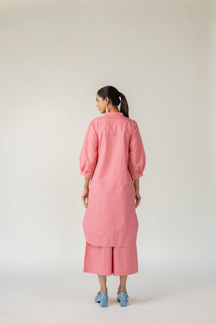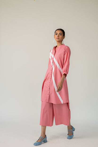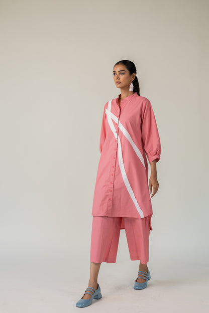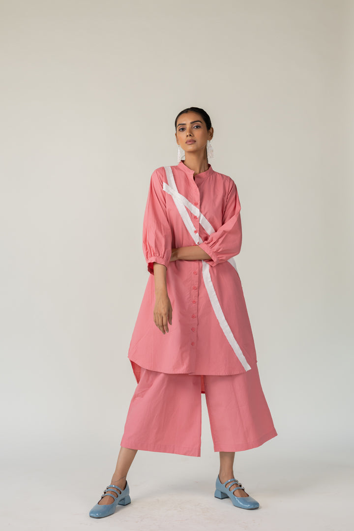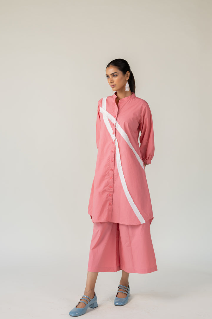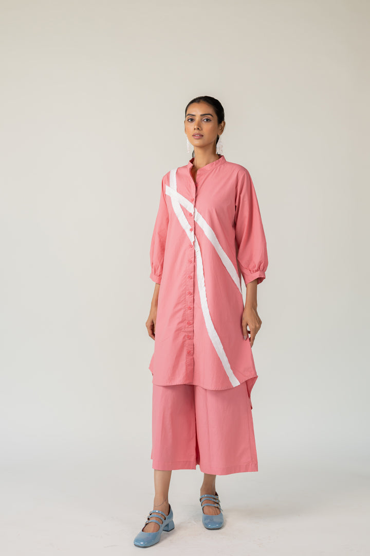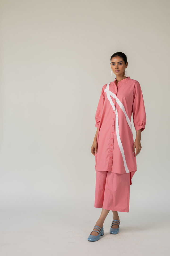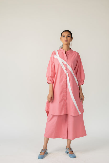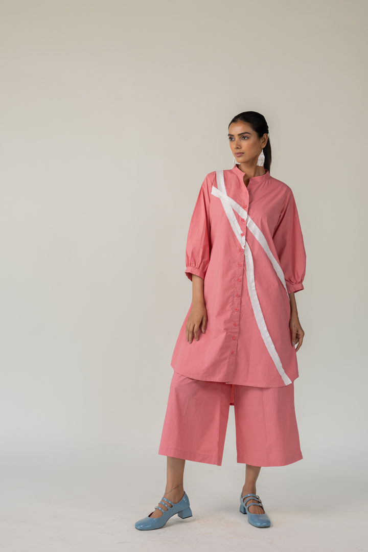 Effortlessly blending structure with playfulness, the Dusky Bloom Buttondown Tunic is crafted in breathable cotton and designed for bold, contemporary dressing. The button-down tunic features a standout diagonal white stripe detail that adds modern geometry to the soft rose base. This Tunic offers both comfort and visual interest — perfect for day-to-evening transitions.