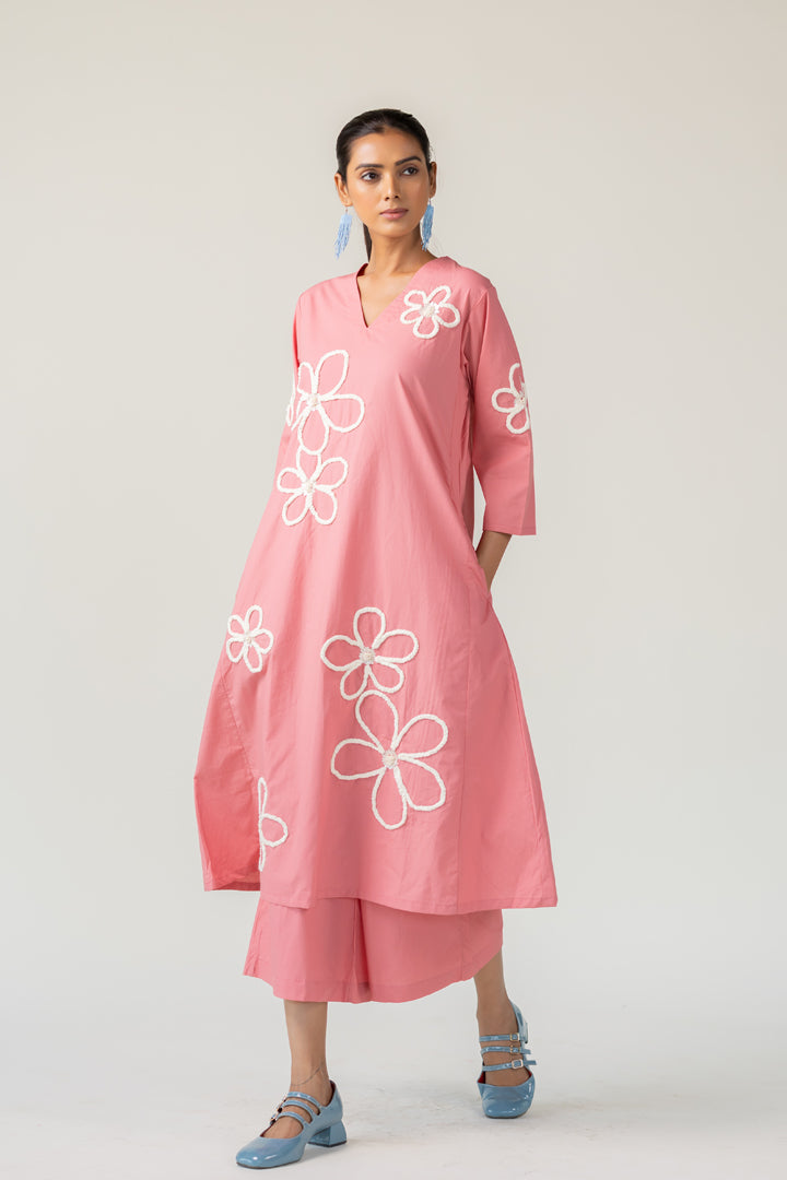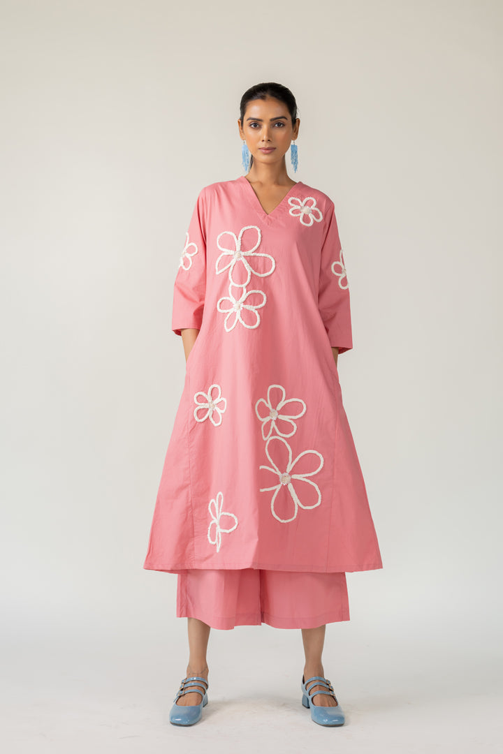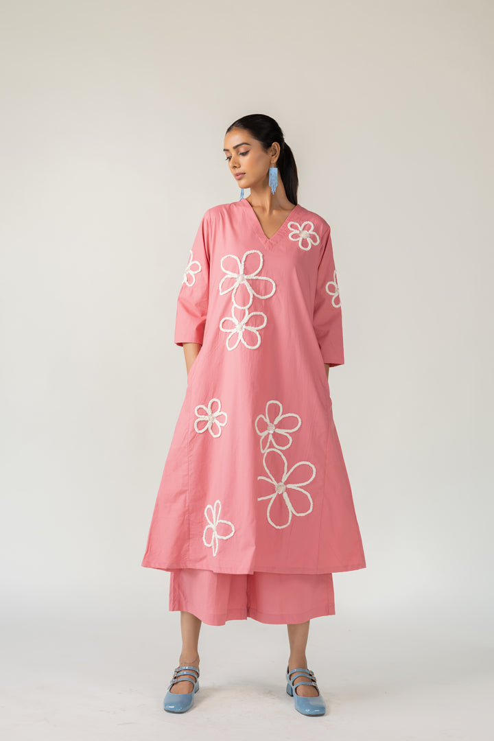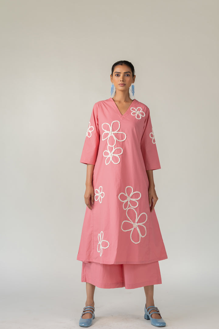 Bring a sense of whimsy and charm to your wardrobe with the Dusky Bloom Kurta. Crafted from breathable cotton poplin in a delightful blush pink tone, this relaxed-fit Kurta is adorned with oversized white embroidered daisies — giving it a playful, retro-inspired feel. The Kurta features a deep V neckline and pockets for convenience.