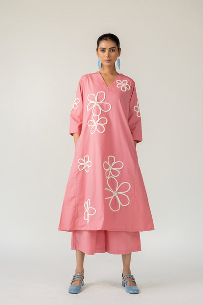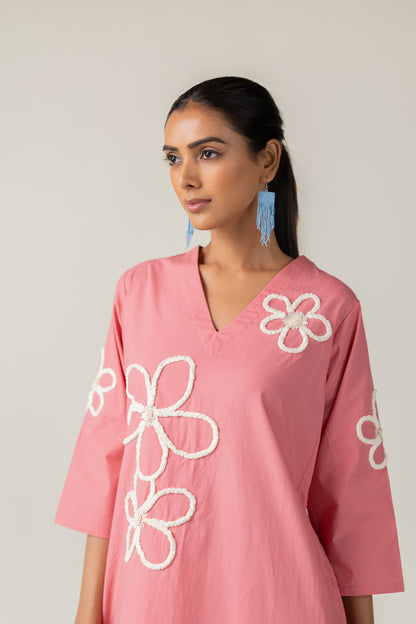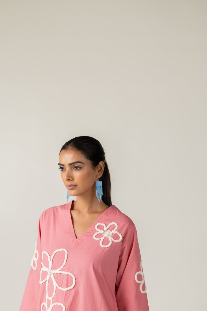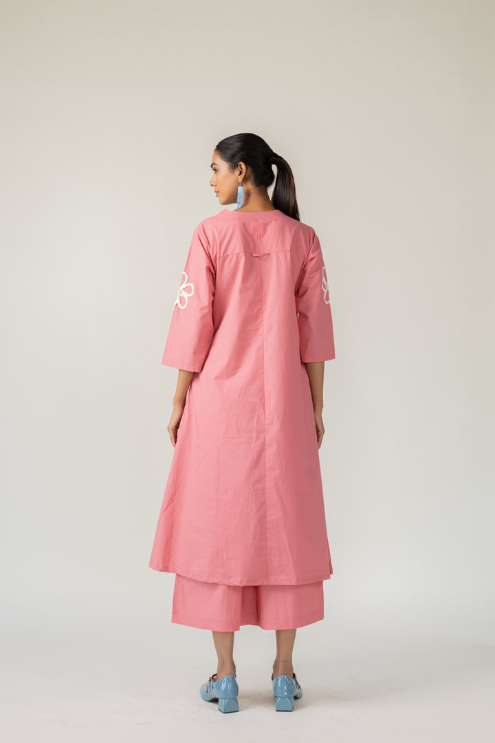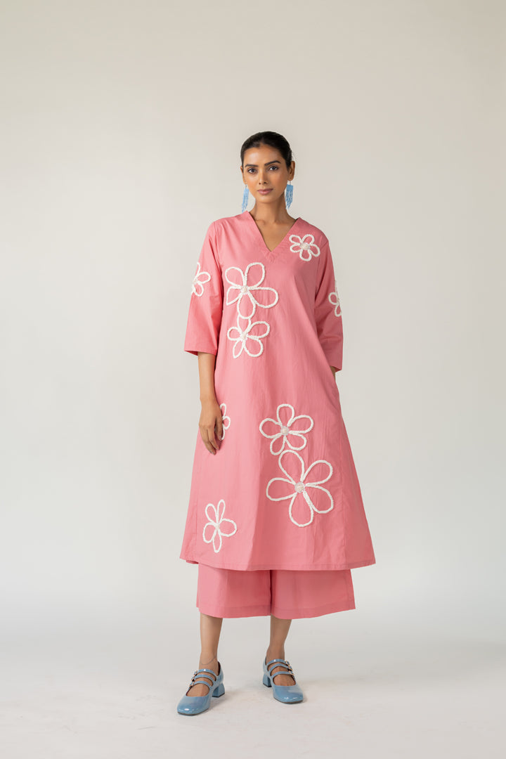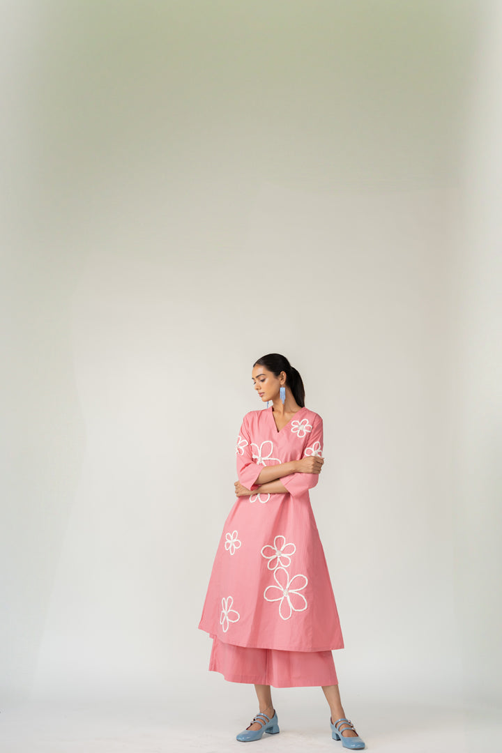 Bring a sense of whimsy and charm to your wardrobe with the Dusky Bloom Kurta. Crafted from breathable cotton poplin in a delightful blush pink tone, this relaxed-fit Kurta is adorned with oversized white embroidered daisies — giving it a playful, retro-inspired feel. The Kurta features a deep V neckline and pockets for convenience.