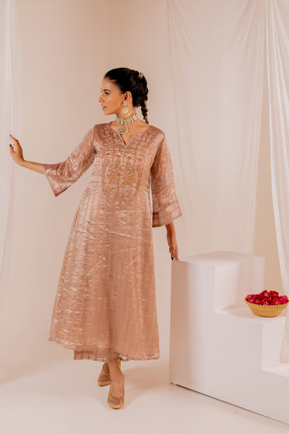 This elegant beige silk kurta offers a perfect blend of sophistication and comfort. The kurta, crafted from rich chanderi fabric, features intricate embroidery on the bodice with delicate Zardosi work, enhancing its timeless charm. The three-quarter bell sleeves add a modern twist. Ideal for festive occasions or formal gatherings, this set promises to make a statement of understated elegance. Kurta is fully lined with cotton mulmul fabric
