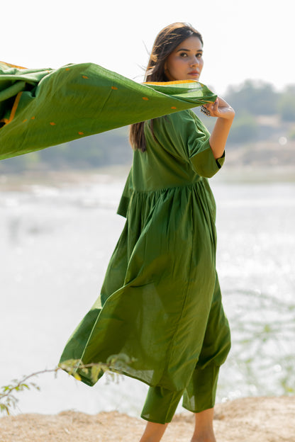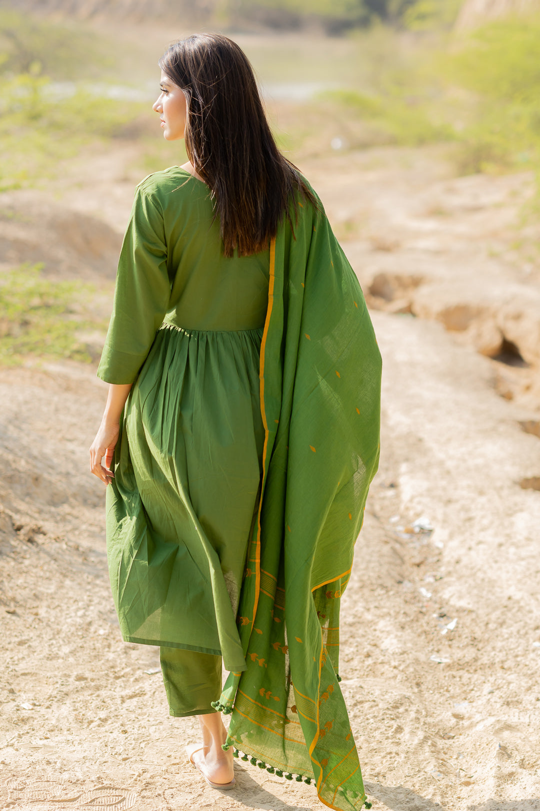 Forest Green Gathered Kurta Set with Jaamdani Dupatta