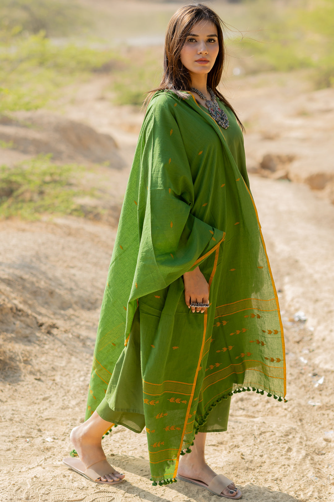 Our Forest Green Flared Kurta Set, designed for effortless grace and comfort. This set features a flowy A-line kurta with soft gathers at the waist, a V-neckline, and three-quarter sleeves. The lightweight cotton fabric ensures breathability, making it ideal for all-day wear. Paired with matching straight-fit pants and a handcrafted Jaamdani dupatta with mustard accents, this set is perfect for casual outings, or everyday musing.