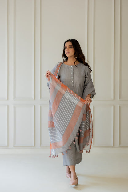 Grey Linen Kurta Set with Dupatta - Set of 3: