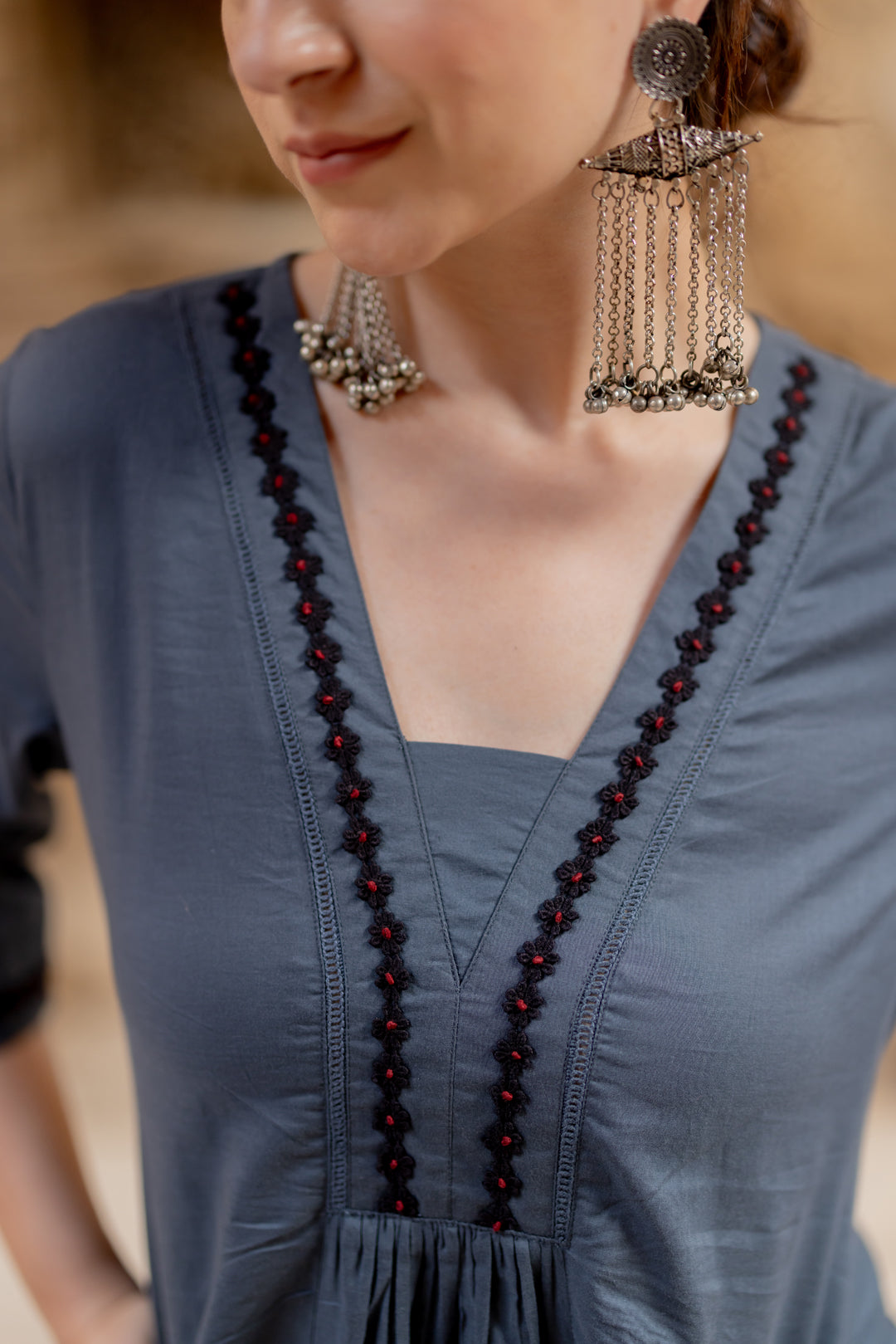 The intricate lace detailing along the neckline adds a delicate, feminine touch to the rich hue.