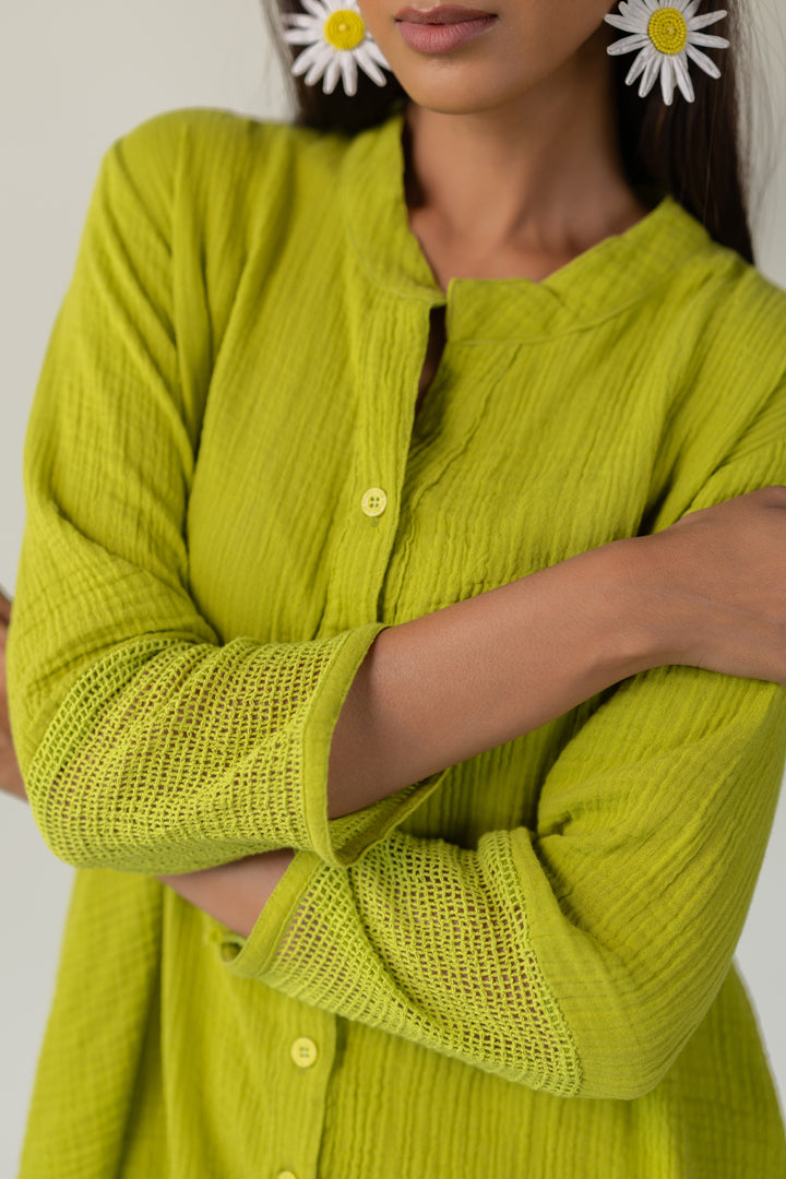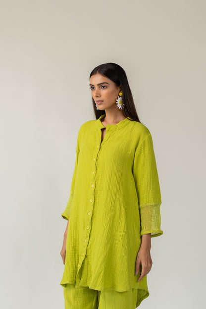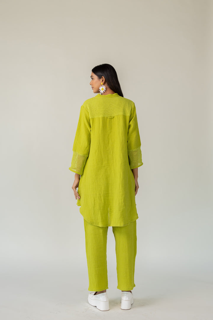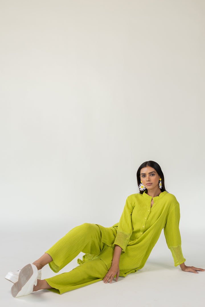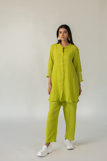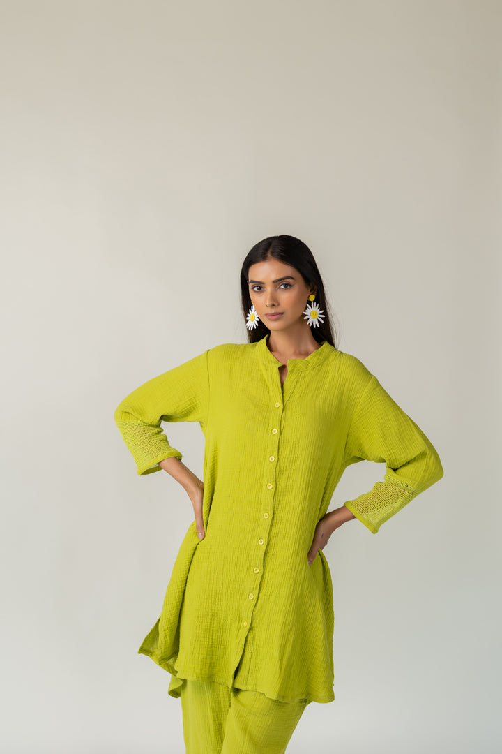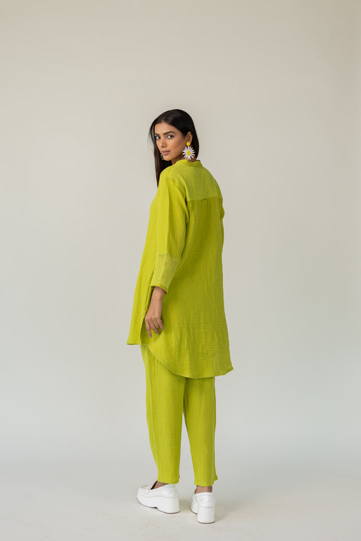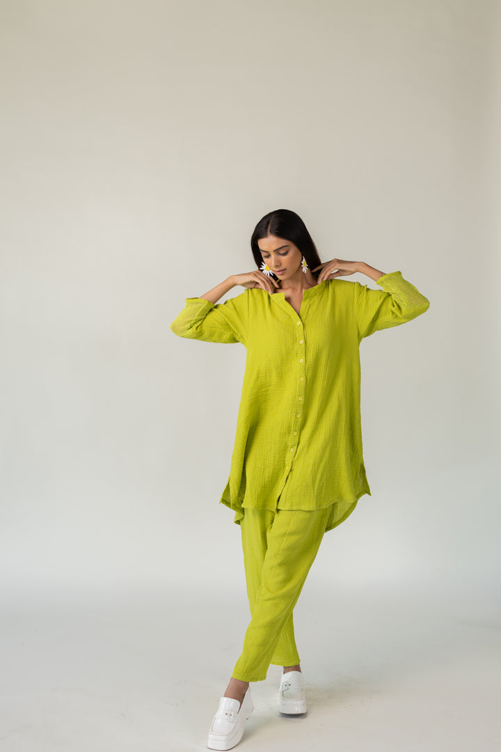 Embrace a playful yet poised look with our Matcha Mist Co-Ord - where vibrant color meets effortless silhouette. Made from soft, textured cotton, this relaxed set features a long shirt with a full button-down front, and high low hem. The matching tapered pants complete the ensemble with a clean, versatile finish. Ideal for travel, leisure, or casual brunches — style it with statement earrings or minimal sneakers for an elevated laid-back look.