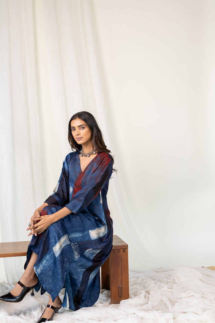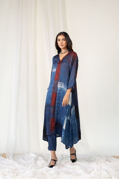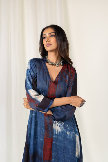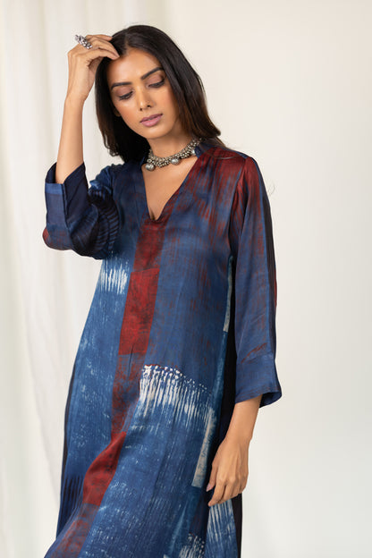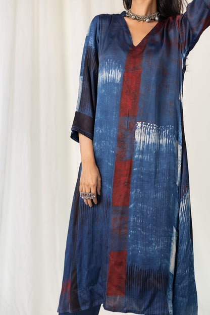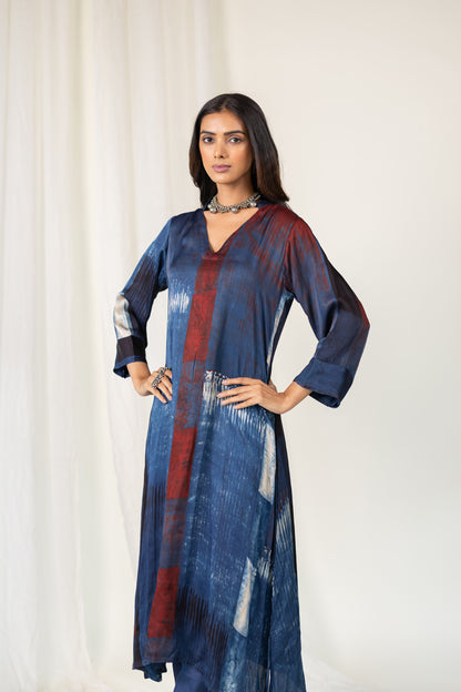 A timeless silhouette meets contemporary artistry in our Navy Crimson Streak Kurta Set. Crafted from breathable modal silk, this indigo kurta features a relaxed fit with three-quarter sleeves and a subtle V-neckline and madarin collar. The rich navy base is accented with rust-red and off-white brushstroke-inspired print, creating a striking linear pattern that evokes understated elegance. Paired with plain navy blue pants, this set offers both comfort and sophistication for casual evenings.