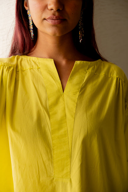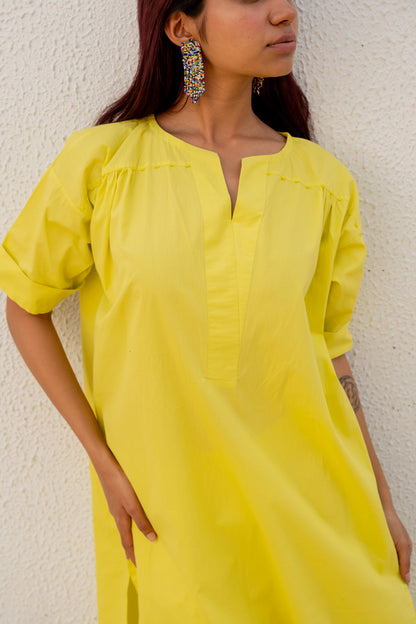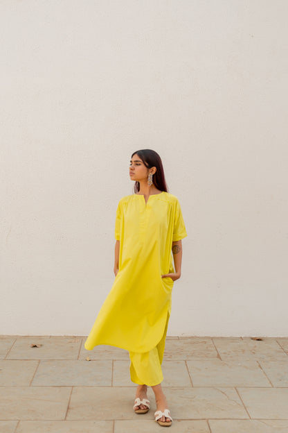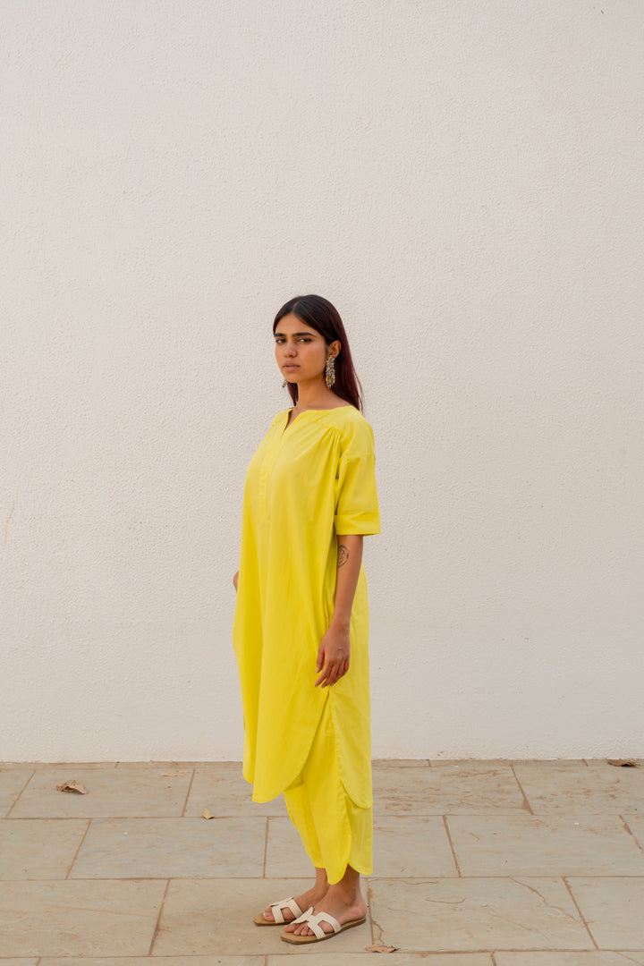 Our Neembu Yellow Tunic Co-Ord comes with an anti-fitted straight tunic with short, curved side slits. The straight armhole and slight gatheres on the bodice make for subtle and effective details. The tunic has pockets. The boat neck with an overlapping placket creates a flattering V cut in the neckline. The pants have back elastic for ease and comfort.