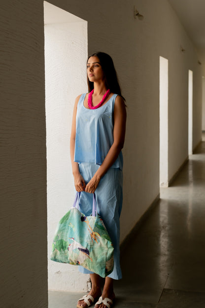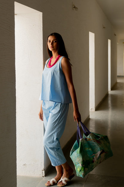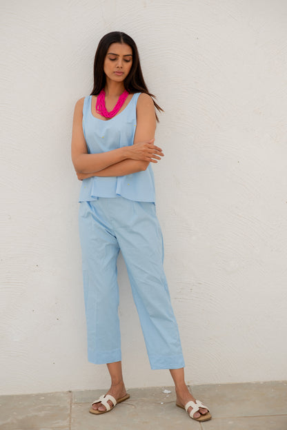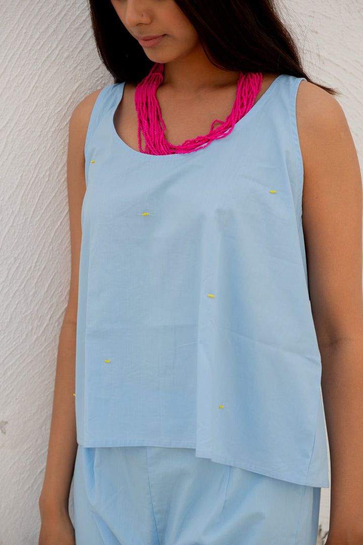 Our Pale Blue Co-ord comprises of a short top and pants. The sleeveless racerback top is a staple addition to your wardrobe and can be styled in multiple ways for casual looks. The delicate beadwork adds a little detail to the basic silhouette. Pants have back elastic for optimal comfort.