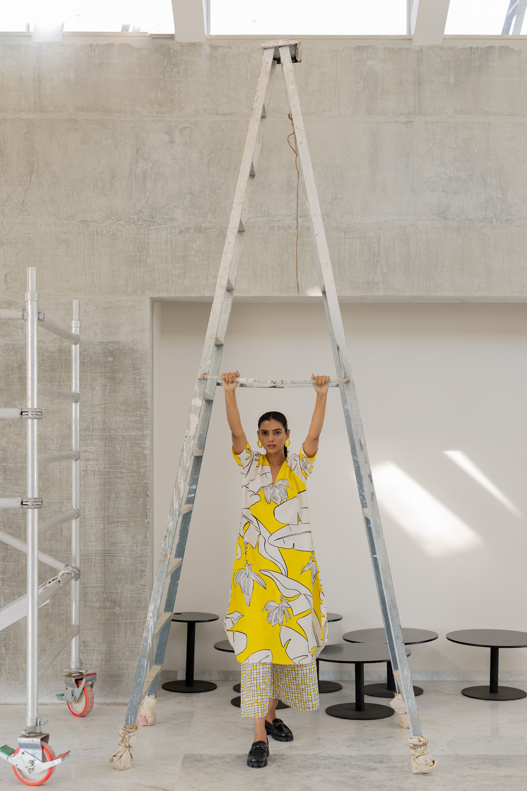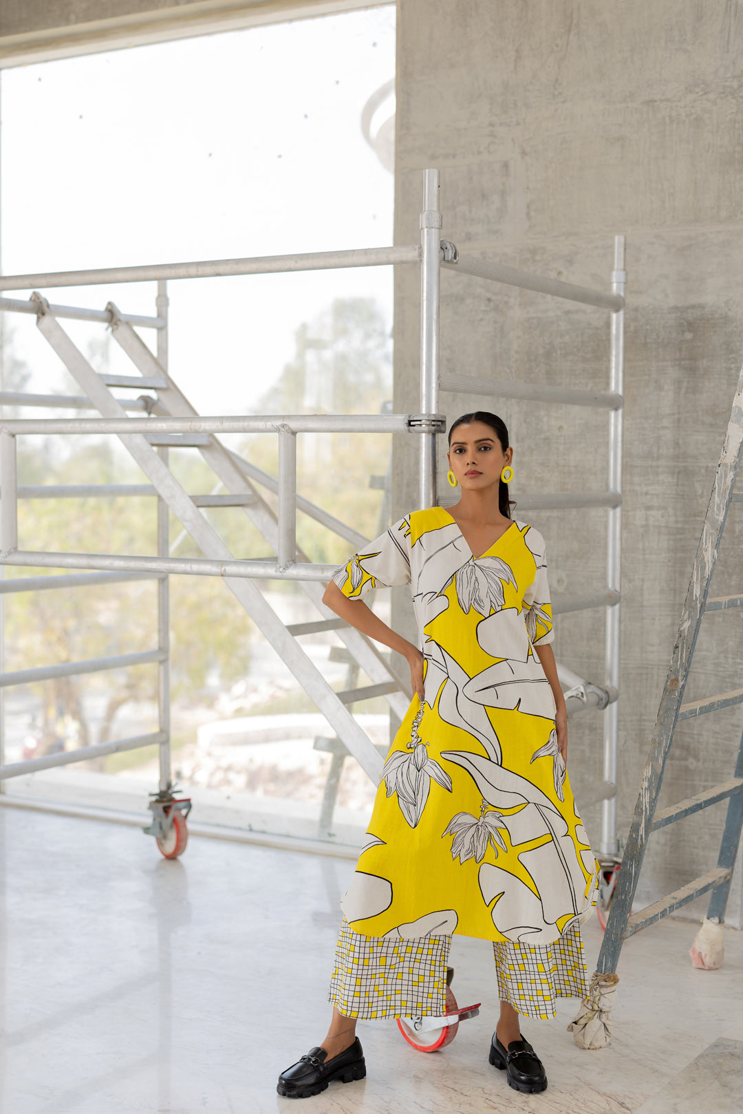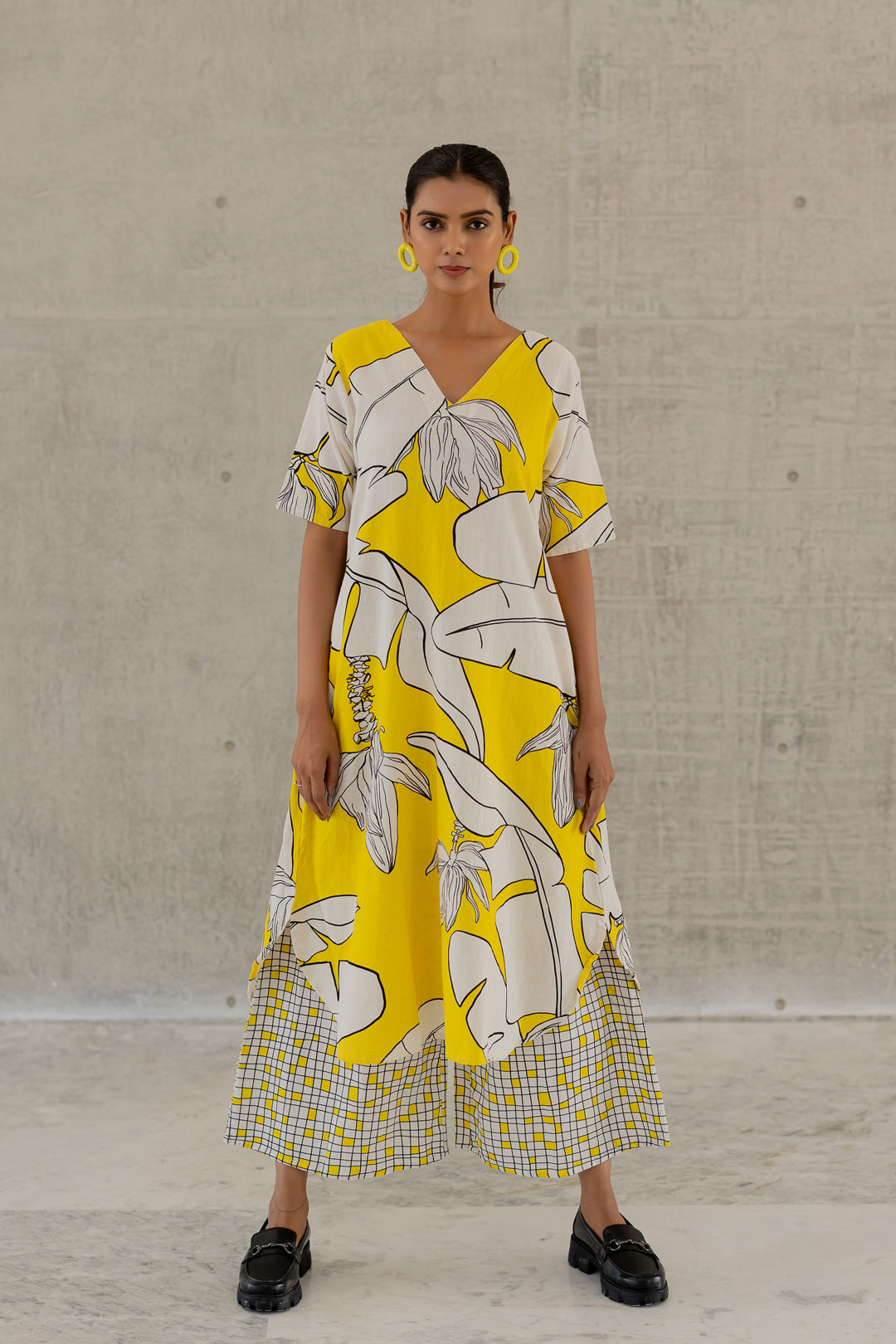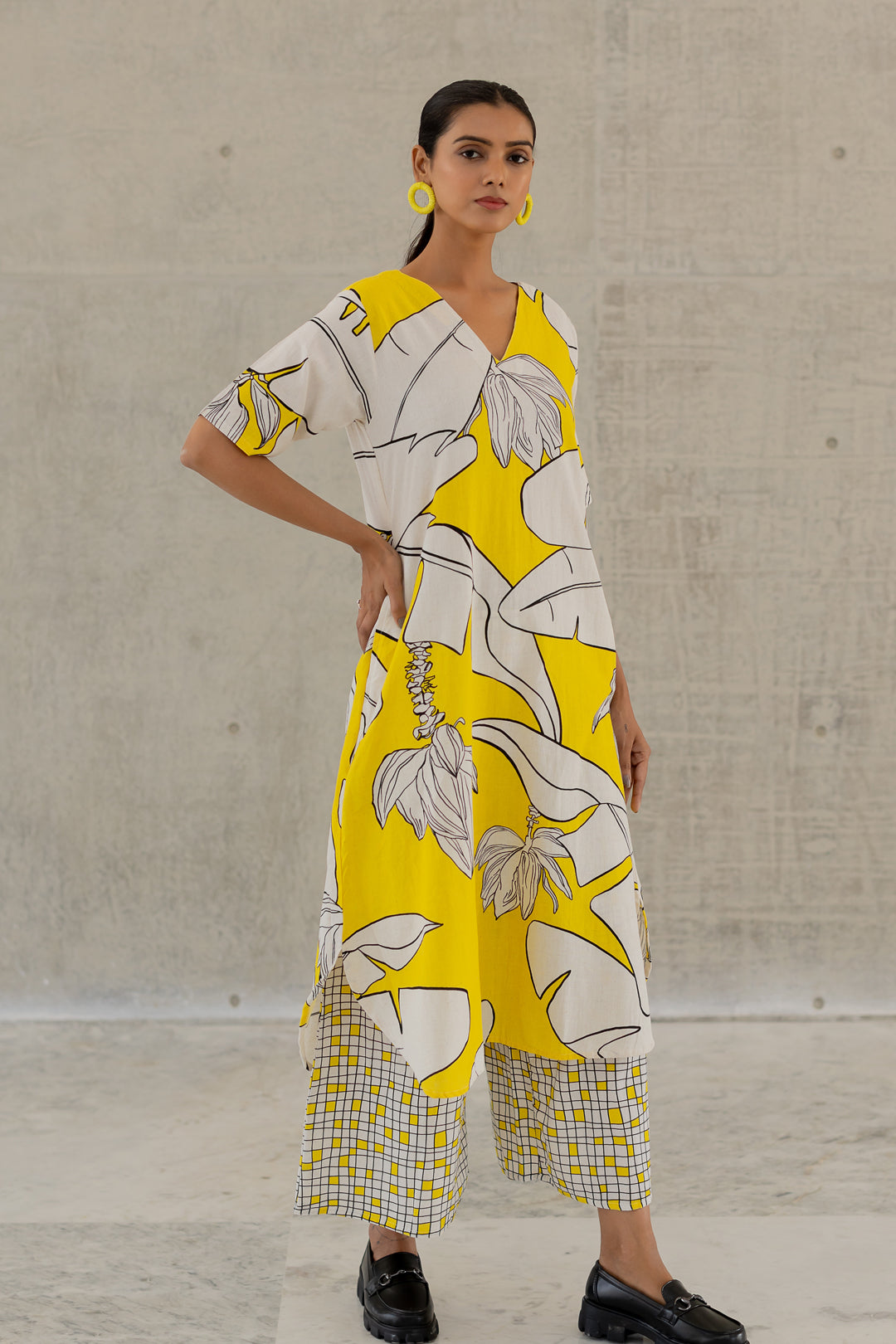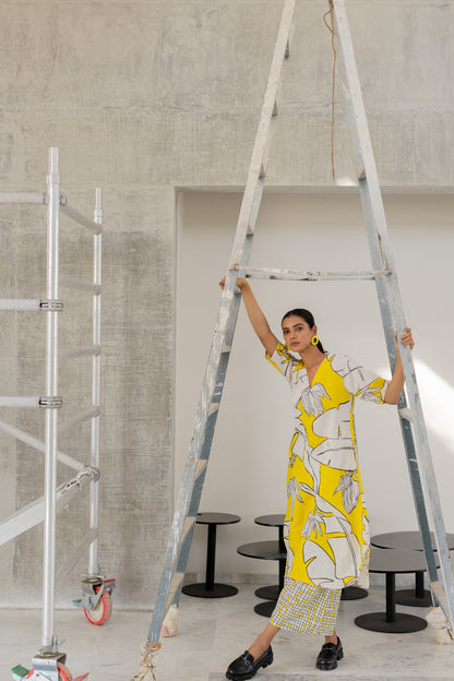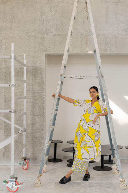 A striking blend of bold prints and effortless elegance. The flowy kurta features a relaxed V-neckline, short sleeves, and a vibrant yellow and white botanical print. Paired with wide-leg checkered palazzo pants, this co-ord set balances playfulness with sophistication. Crafted in a breathable cotton-linen blend, it ensures all-day comfort and fluid movement.