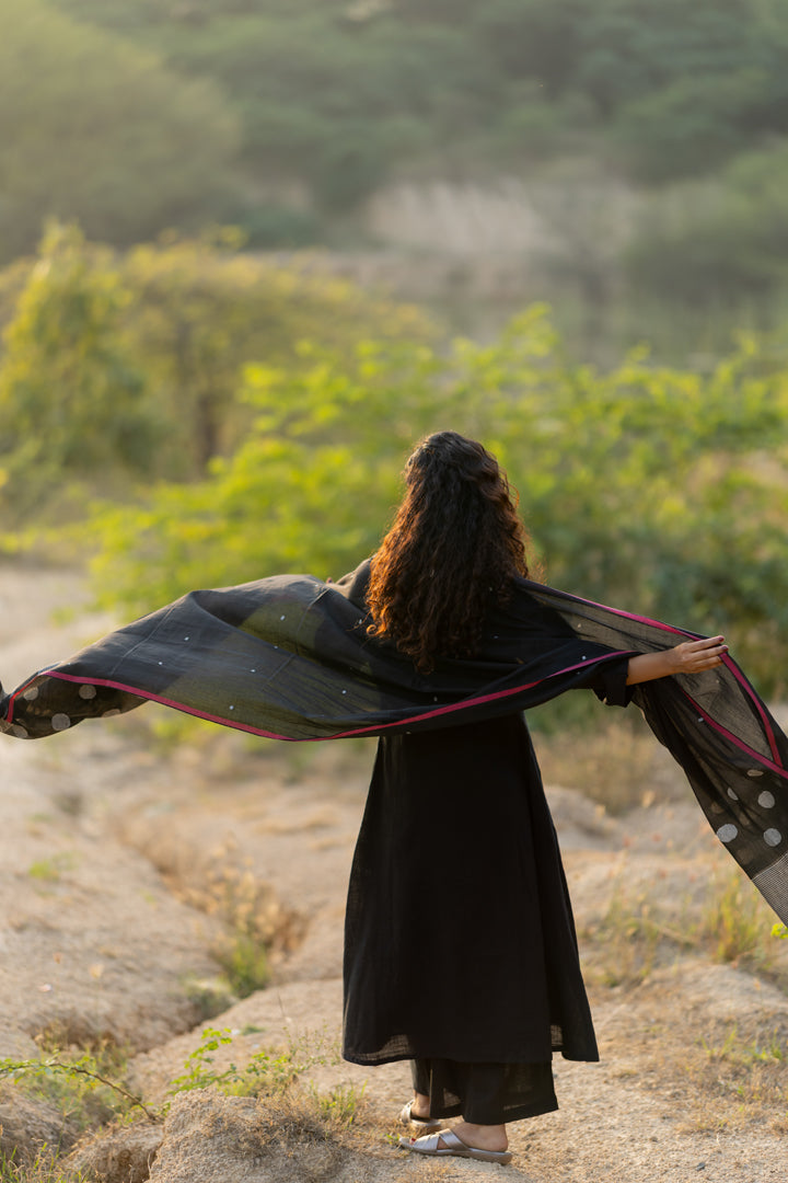 This black slub A-line kurta offers a refined yet relaxed look with its soft texture and graceful fall. The V-neckline lends a modern touch, making the outfit versatile for various occasions. Its airy, lightweight fabric ensures ease and comfort throughout the day. Styled with coordinating pants, it creates a polished, minimalist ensemble that exudes effortless elegance.