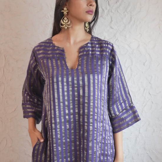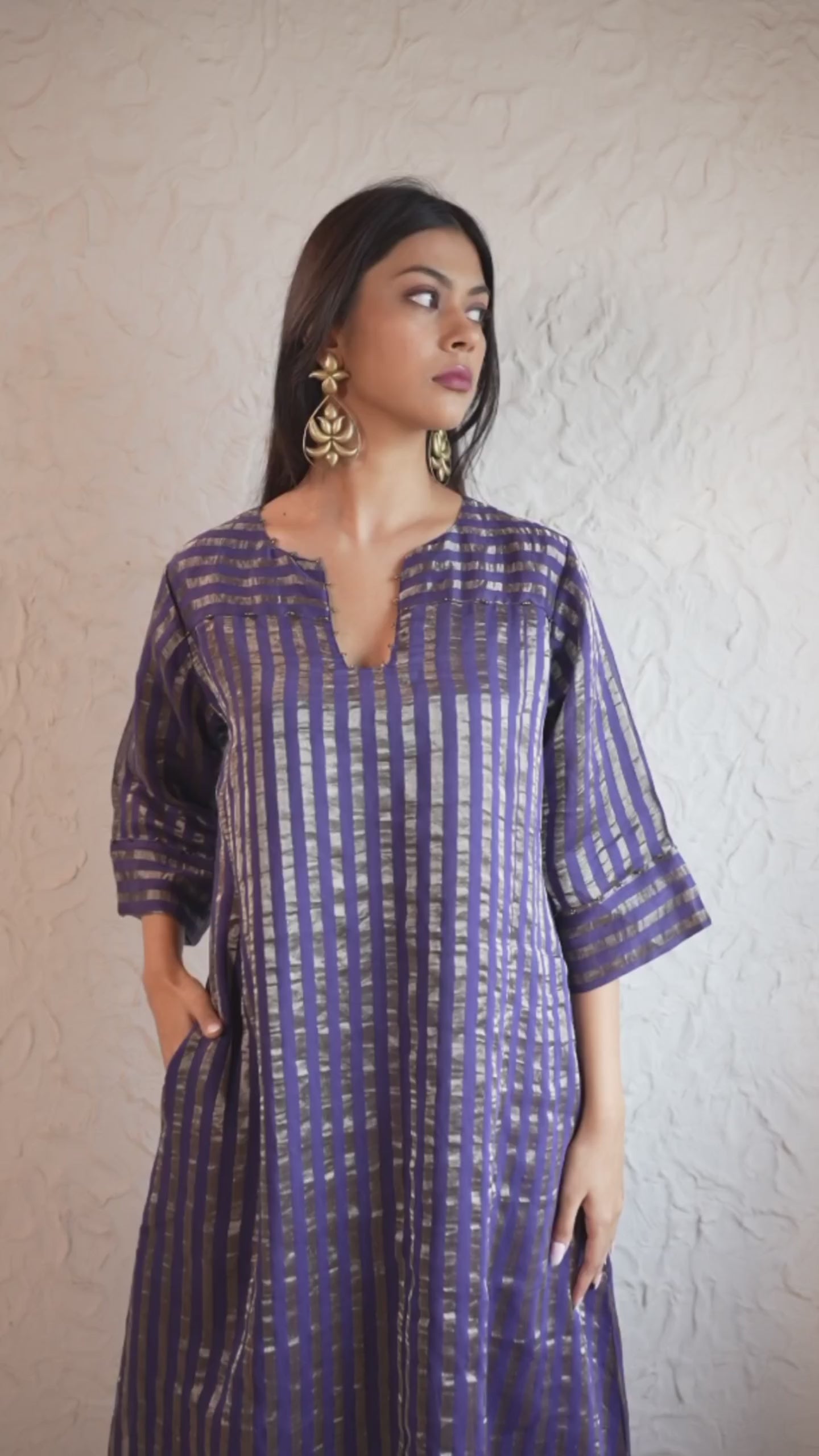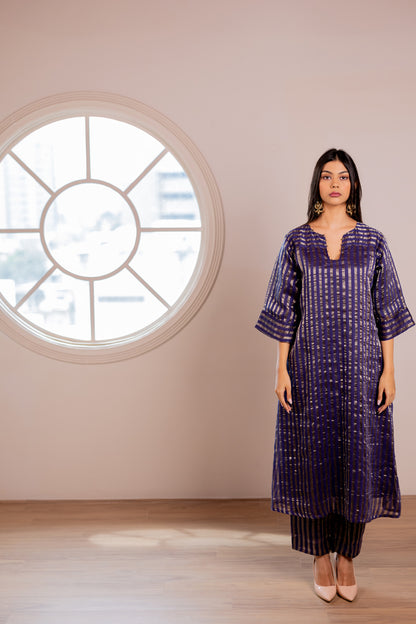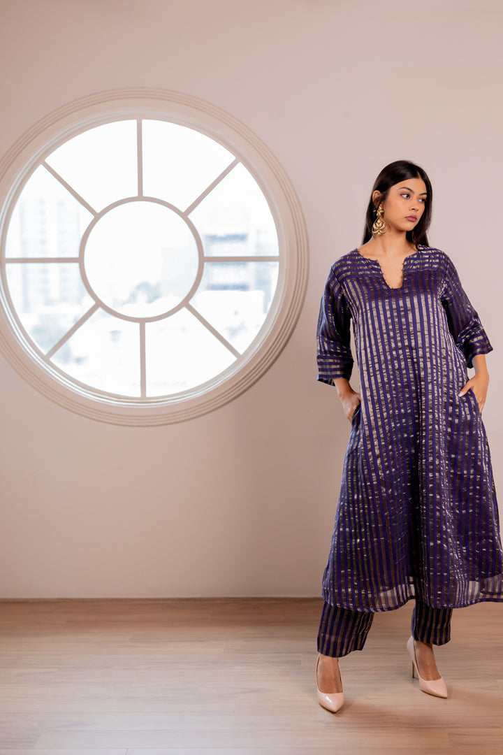 Step into a world of understated elegance with this stunning midnight indigo kurta set. Adorned with vertical metallic stripes that shimmer with every movement, this kurta combines traditional charm with a contemporary silhouette. The notched round neckline and 3/4th sleeves create a balanced, sophisticated look, while the relaxed fit allows for comfort and style. Paired with matching striped pants, this outfit is perfect for festive occasions or evening events, offering a unique blend of simplicity and luxury. Kurta and pants are fully lined with cotton mulmul fabric