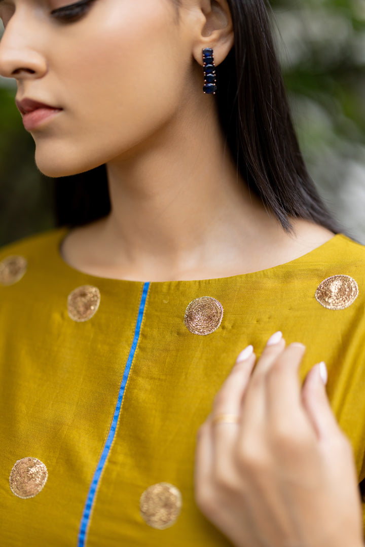Radiates understated glamour with its rich hue and elegant silhouette .The kurta is beautifully adorned with metallic gold circle embroidery, adding a refined texture and shimmering detail. Paired with matching pants, the set offers a cohesive and polished look.