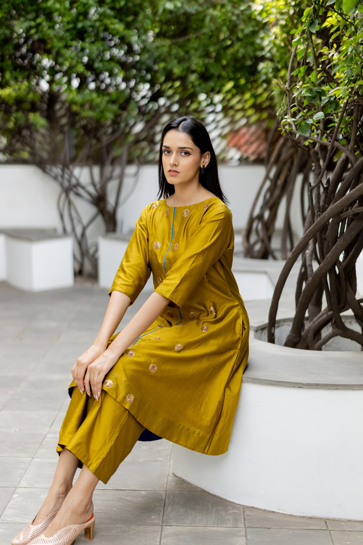 Golden Chanderi A-line Embroidered Kurta Pant - Set of 2