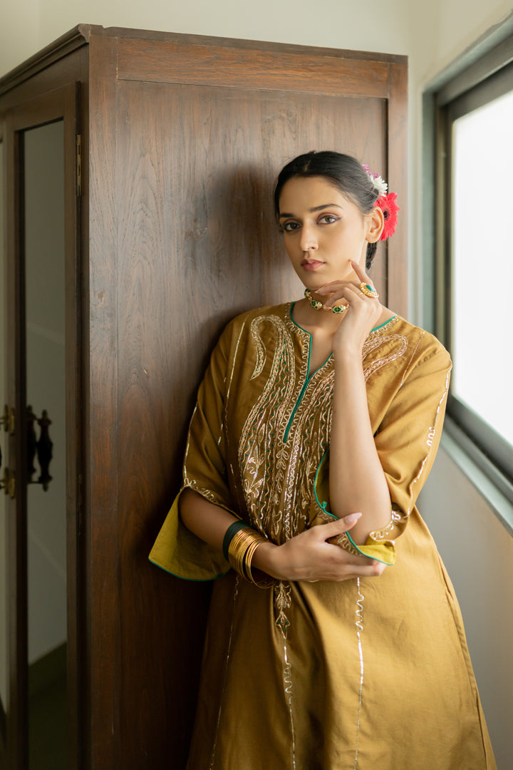 Golden Chanderi Short A-line Embroidered Kurti and Plazzo -Set of 2